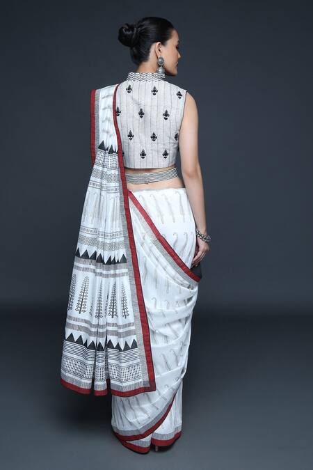 Ivory, black, and red chanderi saree featuring paisley motif hand block print. Paired with a hand printed and embroidered blouse with a band collar and sleeveless design.