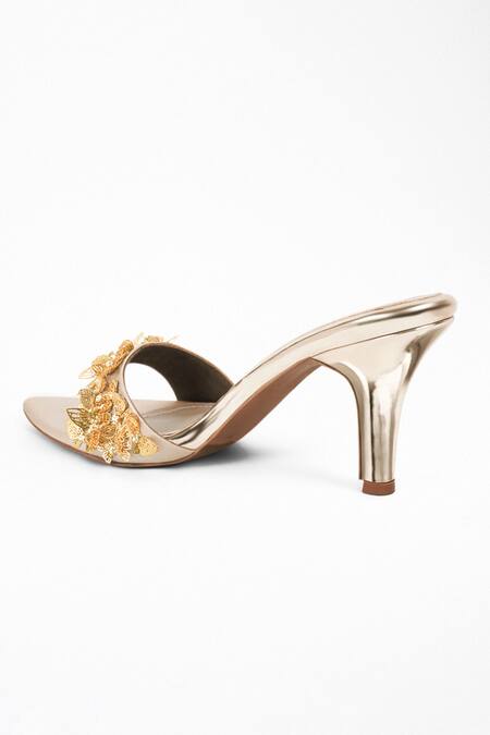 Gold heels featuring butterfly hand embroidery on the strap