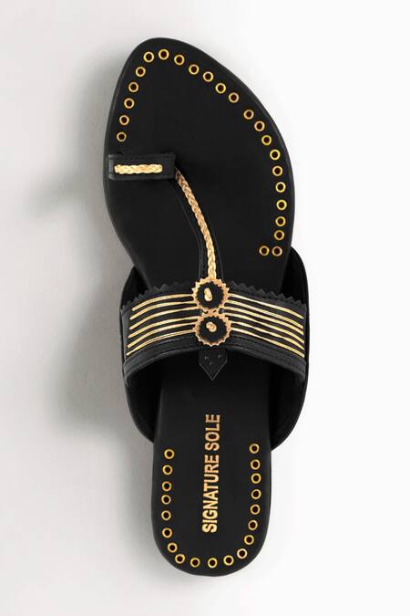 Black kolhapuri flats featuring intricate golden kasab hand embroidery