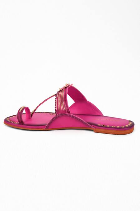 Pink kolhapuri flats featuring intricate braiding and golden kasab hand embroidery