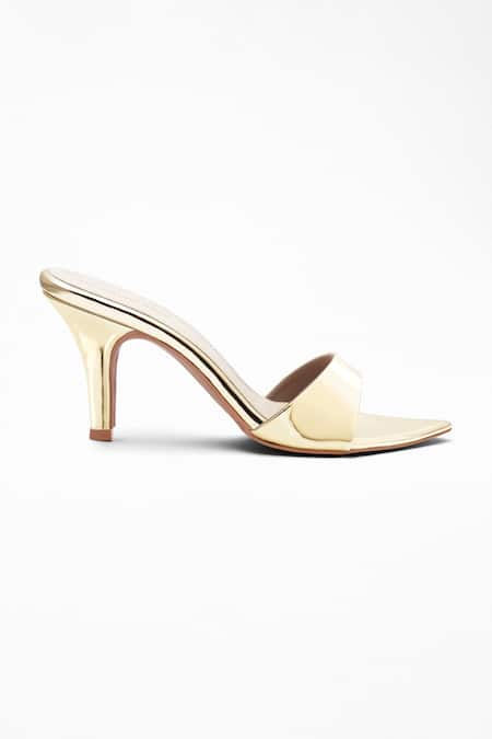 Gold mirror finished pointed toe heels featuring a chiseled toe design