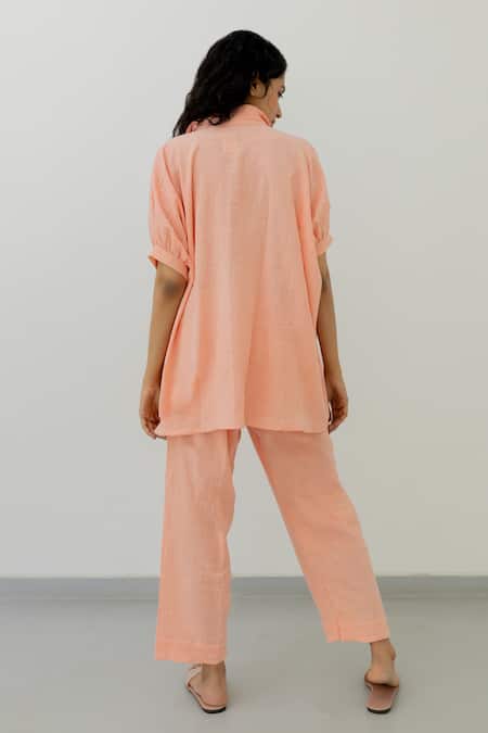Pink Cotton Sequins Collared Embroidered Shirt And Pant Set