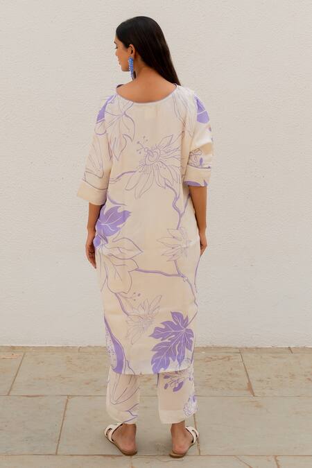 Off white kurta featuring a notched neckline and three quarter sleeves with a floral print. Paired with matching straight pants, both made from silk fabric.