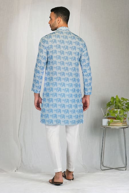 Blue kurta featuring an all-over elephant print with a stand collar and full sleeves. Paired with white straight fit pants, the set includes side pockets and a half button placket.