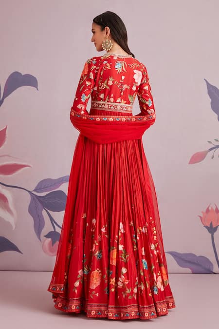 Red anarkali with floral block printed motifs and embroidered yoke. Comes with net dupatta.