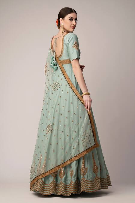 Mint blue anarkali with leaf & scallop embroidery. Paired with embroidered sheer dupatta.