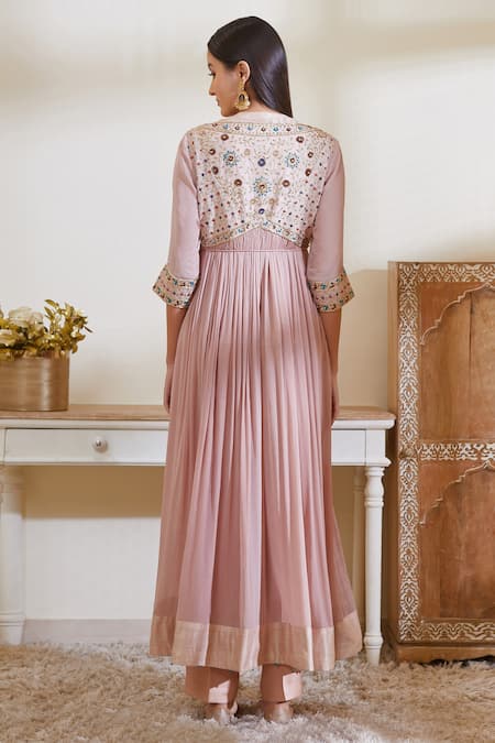 Rose gold angrakha style anarkali with zardozi & sequin embellishments. Comes with straight pants, inner & belt