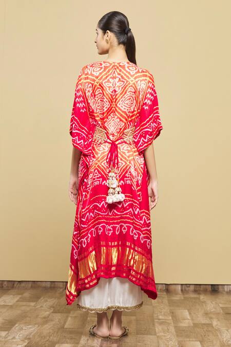 Buy_Tisha Saksena_Red Kurta Bandhani Pant Cotton Satin Belt Raw V Kaftan Tunic Set_Online_at_Aza_Fashions
