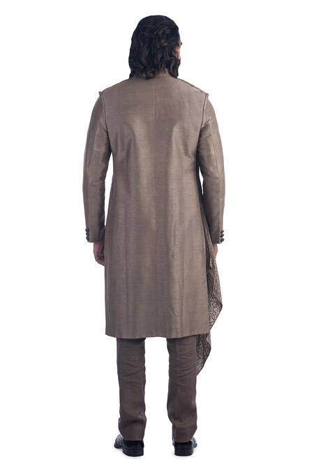 Taupe bandhgala with attached abstract embroidered stole. Paired with pant.
