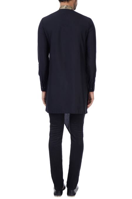 Black asymmetric draped style kurta with a kinkhab brocade embroidered collar.