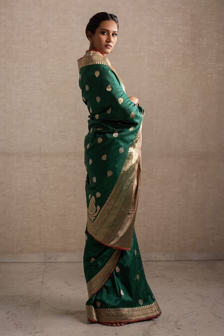 Buy_Priyanka Raajiv_Green Silk Brocade Banarasi Thread Saree_at_Aza_Fashions