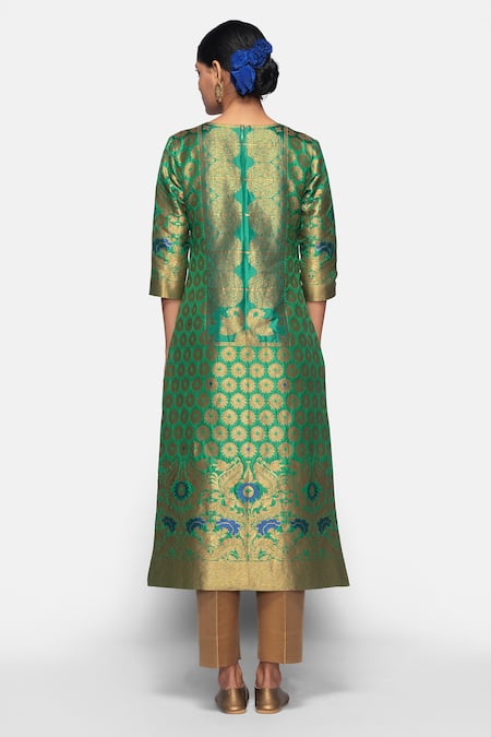 Emerald green straight hem kurta in handwoven silk brocade with contrast floral motifs, side slits & V-neckline.