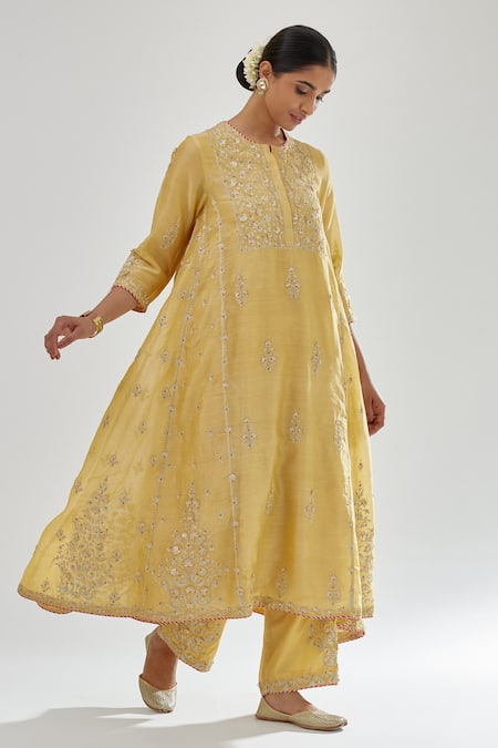 Buy_Kora_Yellow , Chanderi, Organza Gota Patti, Embroidery, A-line Kurta Set _Online_at_Aza_Fashions