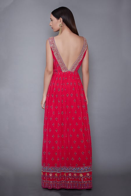 Red Silk Chanderi Boat Embroidered Gown