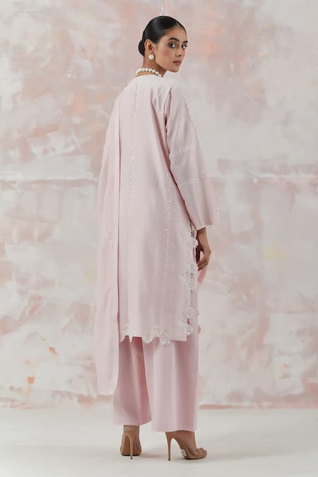 Pink silk chanderi kurta with cutwork and sequin hand embroidery. Comes with palazzo & dupatta.