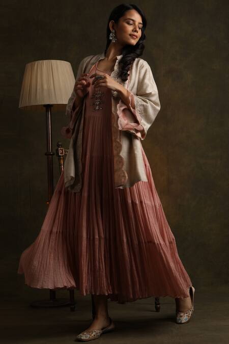 Beige jacket with placement floral motif work & scallop border. Comes with pink tiered dress.