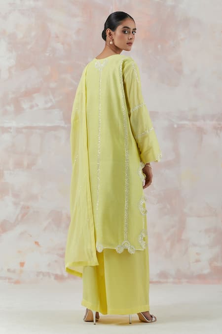 Yellow silk chanderi kurta with cutwork and sequin hand embroidery. Comes with palazzo & dupatta.