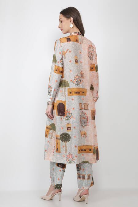 Buy_Jajaabor_Multi Color Silk Chanderi Fort Print Collared Neck Kurta And Pant Set_Online_at_Aza_Fashions