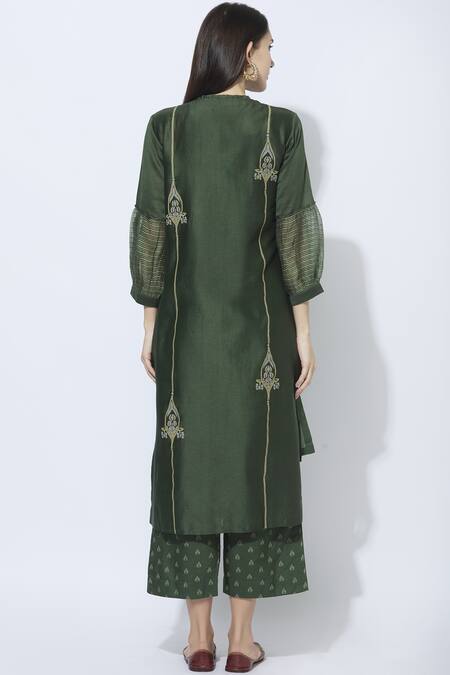 Olive green kurta with placement applique work. Comes with geometric print pants & inner slip.