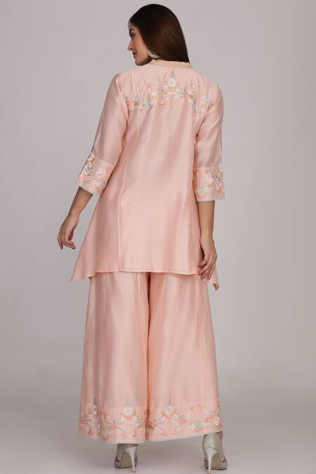 Buy_Anju & Harleen_Peach Silk Chanderi Notched Kurta Set_Online_at_Aza_Fashions