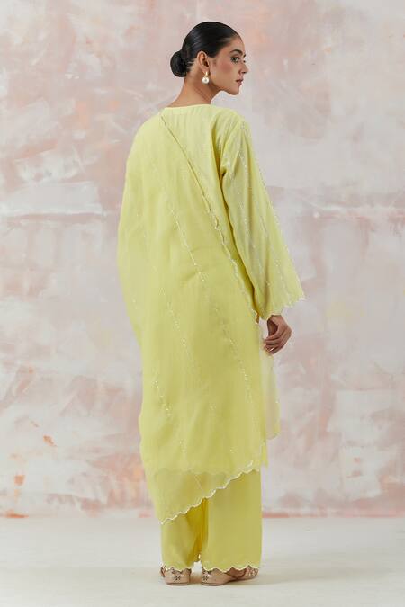 Yellow ombre silk chanderi kurta with stripes, sequin hand embroidery & scallop hem. Comes with palazzo & dupatta.