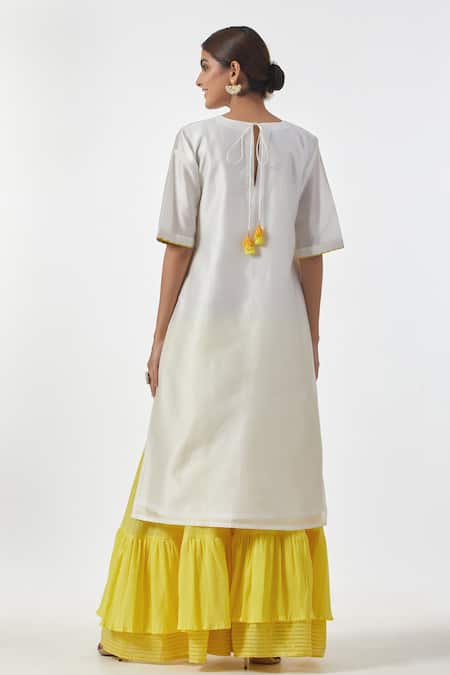 Contrast trims on sleeves & neckline hem, Side slit kurta, Back tassel tie-up, Note:The sharara & dupatta worn by the model is not for sale