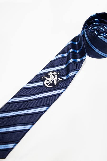 Dark blue tie featuring contrast crest embroidery and a striped pattern