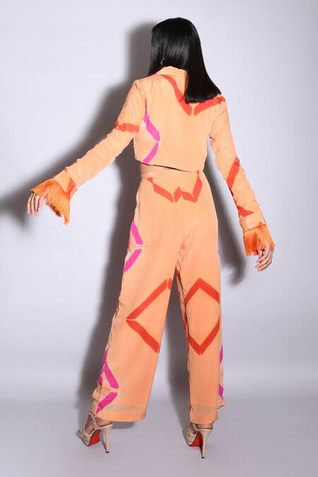 Orange Silk Tie Dye Notched Lapel Cropped Blazer And Pant Set
