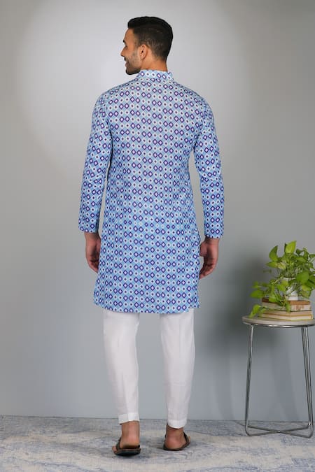 Blue kurta featuring diamond tile print, stand collar, and full sleeves. Paired with white straight fit pant crafted in cotton silk.