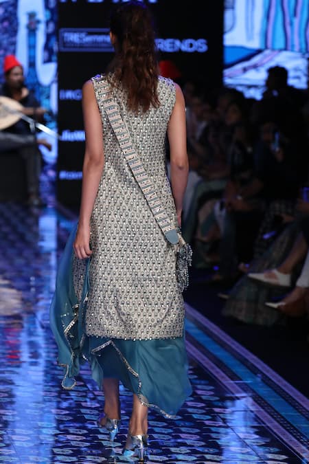 Blue draped skirt with lace & sequin hem. Comes with beige jacket-style kurta enhanced with all-over embroidery.