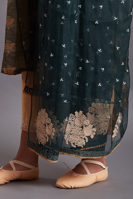 Green silk dupatta with all-over floral embroidered motifs.