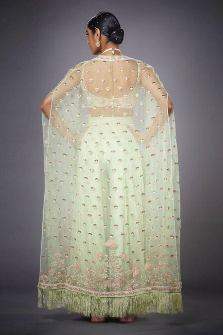 Pista green front-open cape with thread-bead hand worked motifs. Comes with cropped blouse & flared pants.