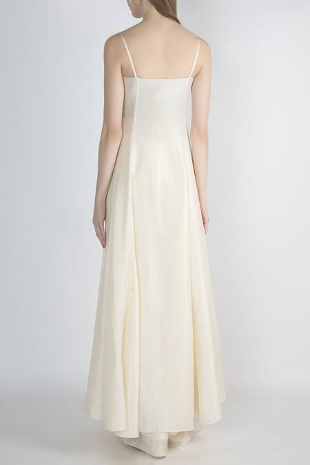 Ivory long kurta with placement floral motif embroidery. Comes with pants & blue crush textured dupatta.