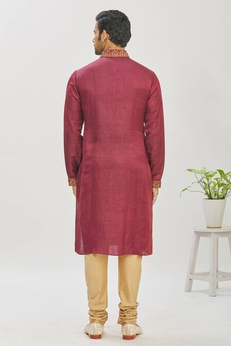 Maroon silk kurta with zardozi embroidered floral motifs on neckline & placket. Paired with gold churidar.