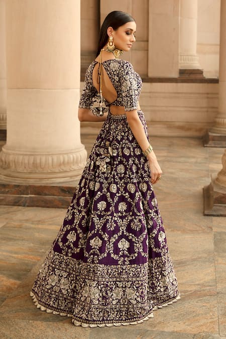Purple lehenga with all over floral zardozi embroidery. Comes with matching blouse and dupatta.
