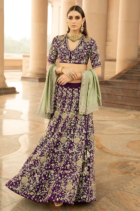 Purple lehenga with all over floral zardozi embroidery. Comes with matching crop blouse and green dupatta.