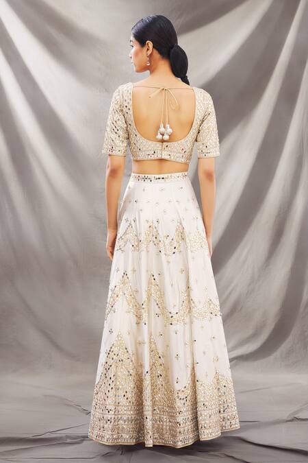 Ivory lehenga with all-over intricate mirror embellishments. Comes with round neckline blouse and dupatta.