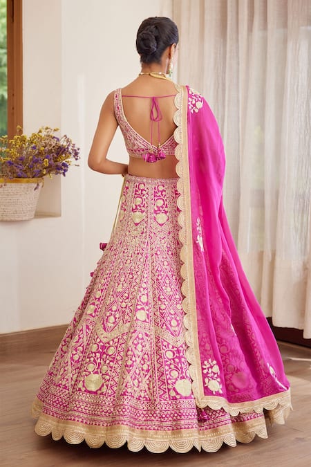 Pink Silk And Net Zari Sweetheart Neck Embroidered Bridal Lehenga Set