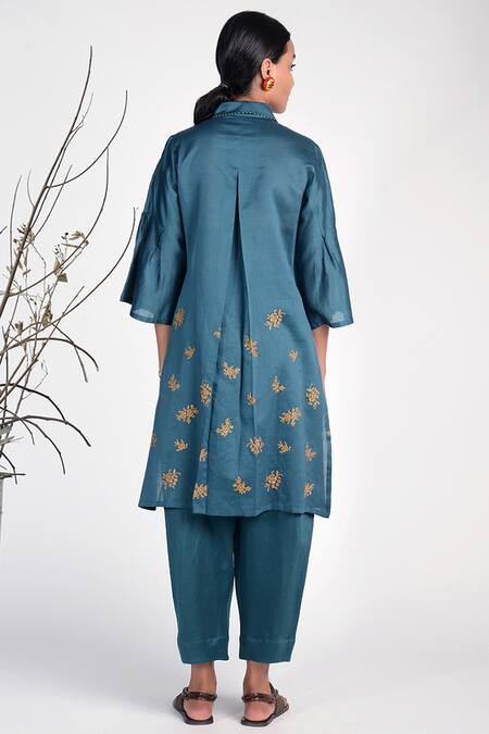 Teal pleated tunic with cross stitch embroidery & flared sleeves.