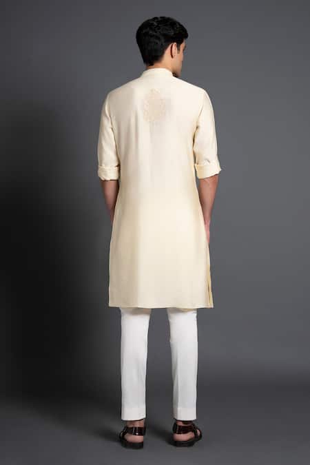 Beige silk kurta featuring floral embroidery around the placket and front buttons