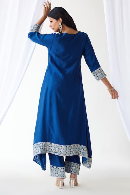 Midnight blue silk kurta featuring zardozi embroidered borders and a handkerchief hem. Paired with embroidered straight pant and organza dupatta.