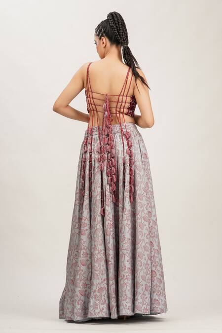 Grey and red silk lehenga in hand block print. Paired with an embroidered choli.