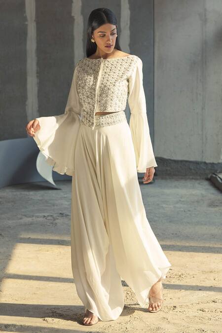 White cropped jacket featuring floral zardozi-bead work and asymmetric hem. Paired with cowl draped pants that have a relaxed fit.