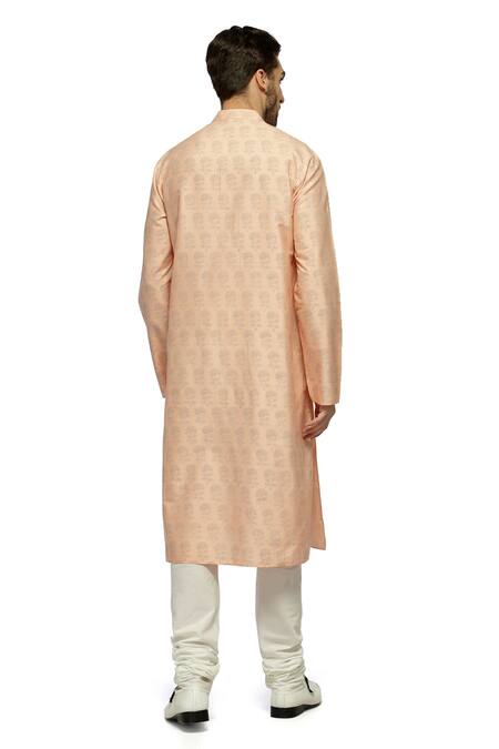 Peach silk katan kurta featuring floral prints and full sleeves. Paired with a plain churidar for a complete look.