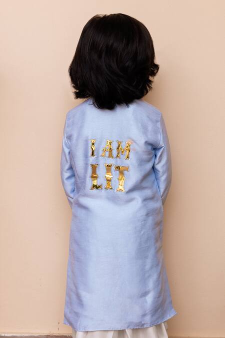 Applique typography on the back, Diamond shaped detailed placket, Side slit design on kurta
