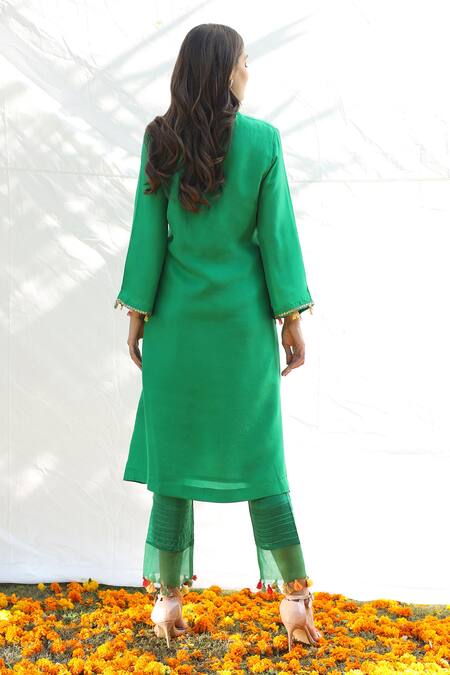 Green silk kurta with embroidered placket and high neck. Comes with pant.
