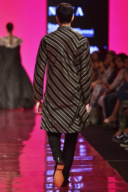 Black & grey angrakha kurta with all-over chevron print. Comes with black pants.