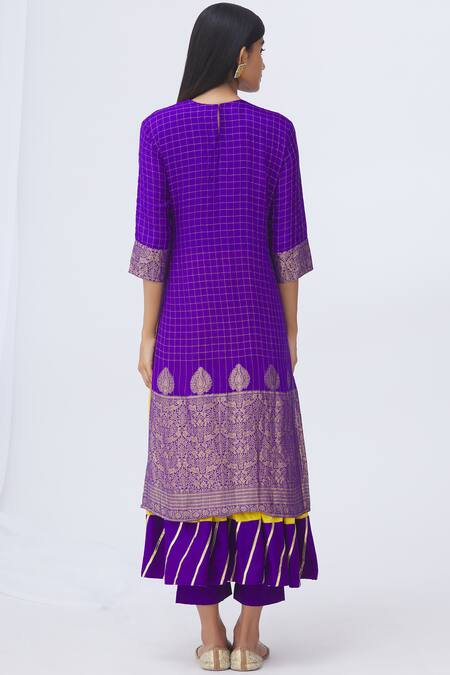 Blue layered kurta with woven motifs & sequin embellishment. Comes with straight pants & embroidered dupatta.