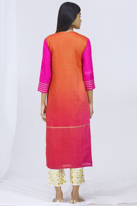 Pink & orange shaded straight kurta with sequin & gota patti embellishment. Comes with off white straight pants & orange dupatta.