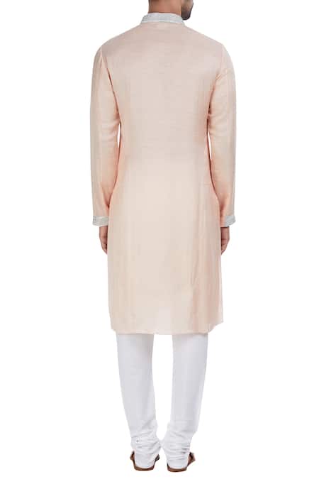 Peach silk kurta with concealed placket & placement embroidery. Comes with contrast churidar.